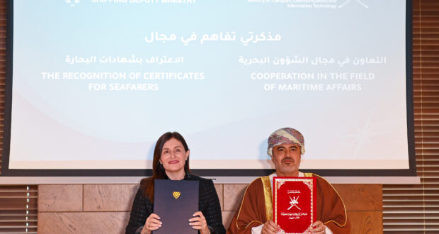 وقّعت سلطنة عُمان ممثلة بوزارة النقل والاتصالات وتقنية المعلومات، وجمهورية قبرص ممثلة بـ وزارة الدولة للنقل البحري، اليوم، مذكرتي تفاهم؛ تتعلق الأولى بتعزيز التعاون في الشؤون البحرية، والثانية بالاعتراف المتبادل بالشهادات البحرية الصادرة في البلدين، وفقا للاتفاقية الدولية لمعايير التدريب والإجازة والخفارة للملاحين لعام 1978 وتعديلاتها.
