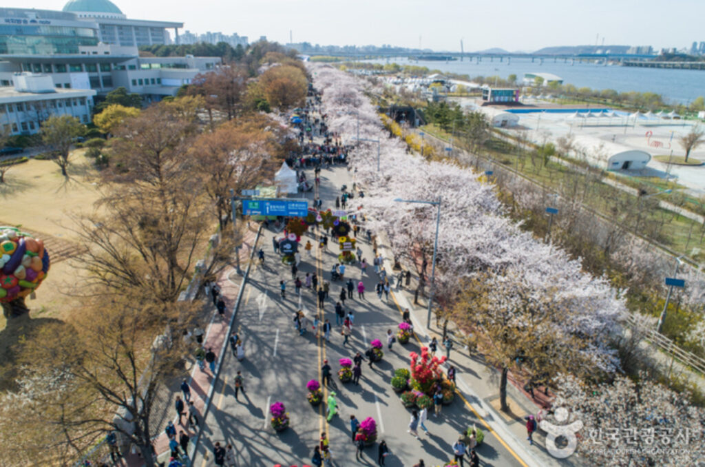 يقع مهرجان Yeouido Spring Flower في الحي المالي النابض بالحياة في سيول ويقدم تجربة خلابة على ضفاف النهر مع أكثر من 1800 شجرة كرز متفتحة.