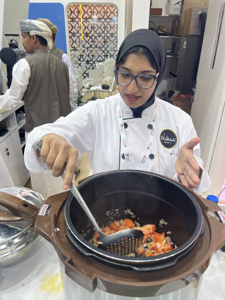 ويقدم ركن الطبخ العماني، سلسلة من فعاليات الطبخ العمانية، مثل كبسة العوال والعرسية والخبيصة. وتقول عهد الجابرية، انها تقوم بطبخ عدة وجبات عمانية تشتهر بها سلطنة عمان وتلقى اقبالا كبيرا من الزوار إلى الجناح، حيث يحرص الجميع على التعرف على هذه الوجبات وطريقة إعدادها، حيث نقوم بتوزيعها مجانا على زوار الجناح وهو بلا شك يسهم في التعريف بالثقافة العمانية وطريقة المطبخ العماني في تقديم وجباته المحلية، حيث يقبل كثير من الزوار إلى سلطنة عمان على تناول الوجبات العمانية لان كل سائح يريد ان يتعرف على كل ما تزخر به عُمان.