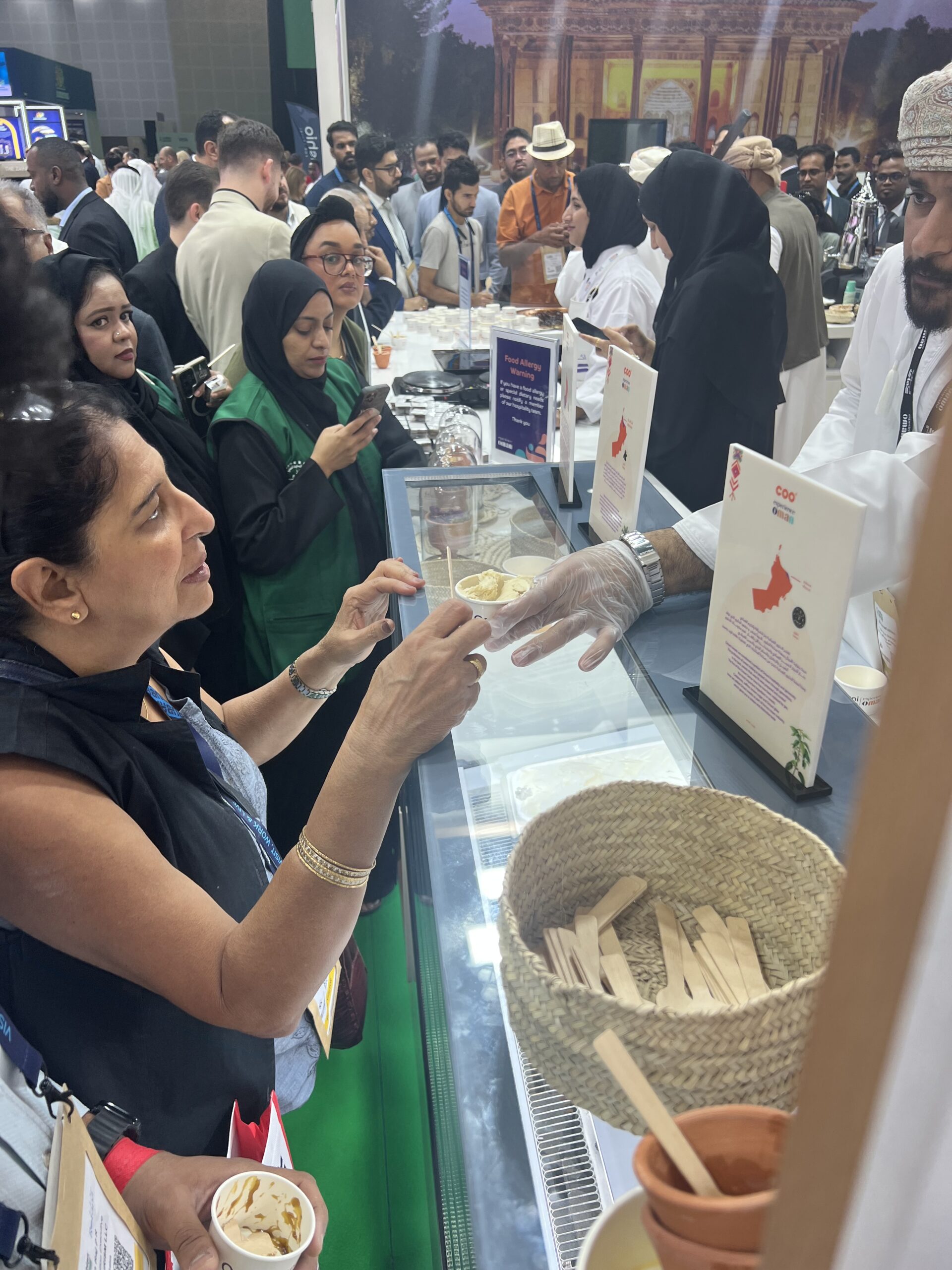 كما يقوم مهند الهنائي بتقديم الايسكريم المحلى بالنكهات المميزة من اللبان والحلوى والورد الجبلي، وهو يقوم بتقديمه مجاناً لزوار الجناح العماني، حتى يتعرفوا على طريقة عمل الايسكريم النكهات المختلفة. ويقول ان مشاركته تسهم في الترويج لمؤسستهم الصغيرة وهذا دعم كبير من وزارة التراث والسياحة للمؤسسات الصغيرة.