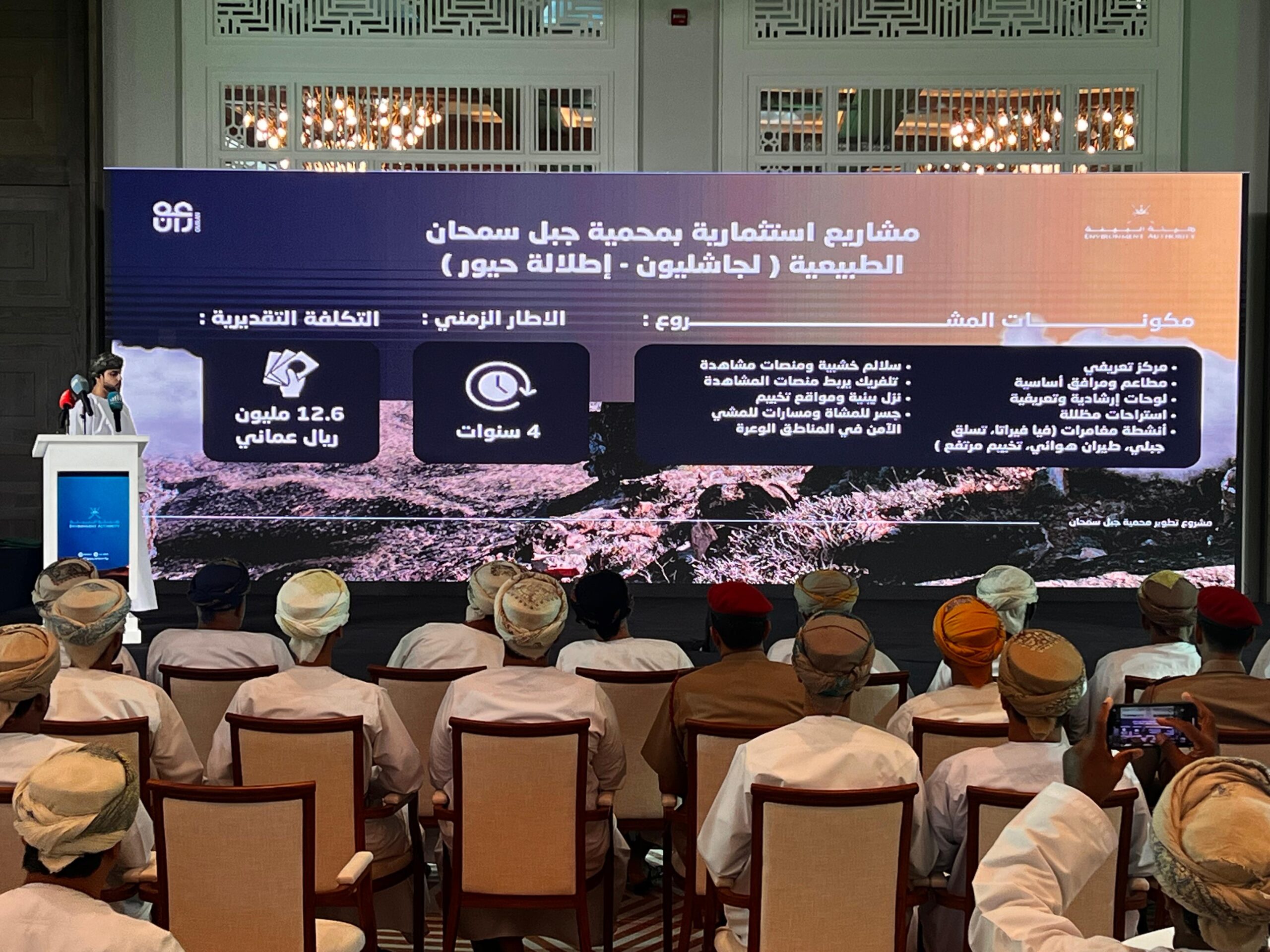 ومن جانبه، استعرض المهندس سليمان بن ناصر الأخزمي مدير عام صون الطبيعة بهيئة البيئة مجموعة المحميات الطبيعية الـ 7 المتنوعة التي تم توقيع العقود الاستثمارية فيها، حيث بلغت مساحة الاستثمارات السياحية البيئية الإجمالية حوالي (5660 كيلومتر مربع) بمبلغ إجمالي بلغ حجم الاستثمارات فيها لأكثر من 44 مليون ريال، وهي: محمية الحجر الغربي لأضواء النجوم بمحافظة الداخلية، ومحمية خور المغسيل في ولاية صلالة بمحافظة ظفار، ولجأشليون بمحمية جبل سمحان وإطلالة حيور في ولاية مرباط بمحافظة ظفار، ومحمية رأس الشجر الطبيعية في ولاية قريات بمحافظة مسقط، ومحمية الأراضي الرطبة بمحافظة الوسطى، ومحمية السلاحف الطبيعية بمحافظة جنوب الشرقية، ومحمية المها العربية بمحافظة الوسطى.