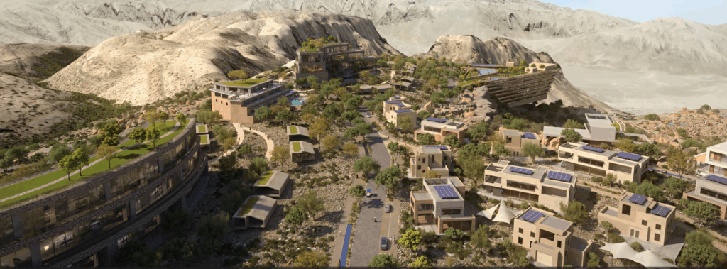 أما مشروع الجبل العالي، الذي صمم على حافة جبلية بطول 5.4 كيلومتر وبمساحة 11.8 كيلو متر مربع، فيستوعب نحو 10 آلاف نسمة ووحدة سكنية مبتكرة ومتنوعة في 3 قرى رئيسة.
