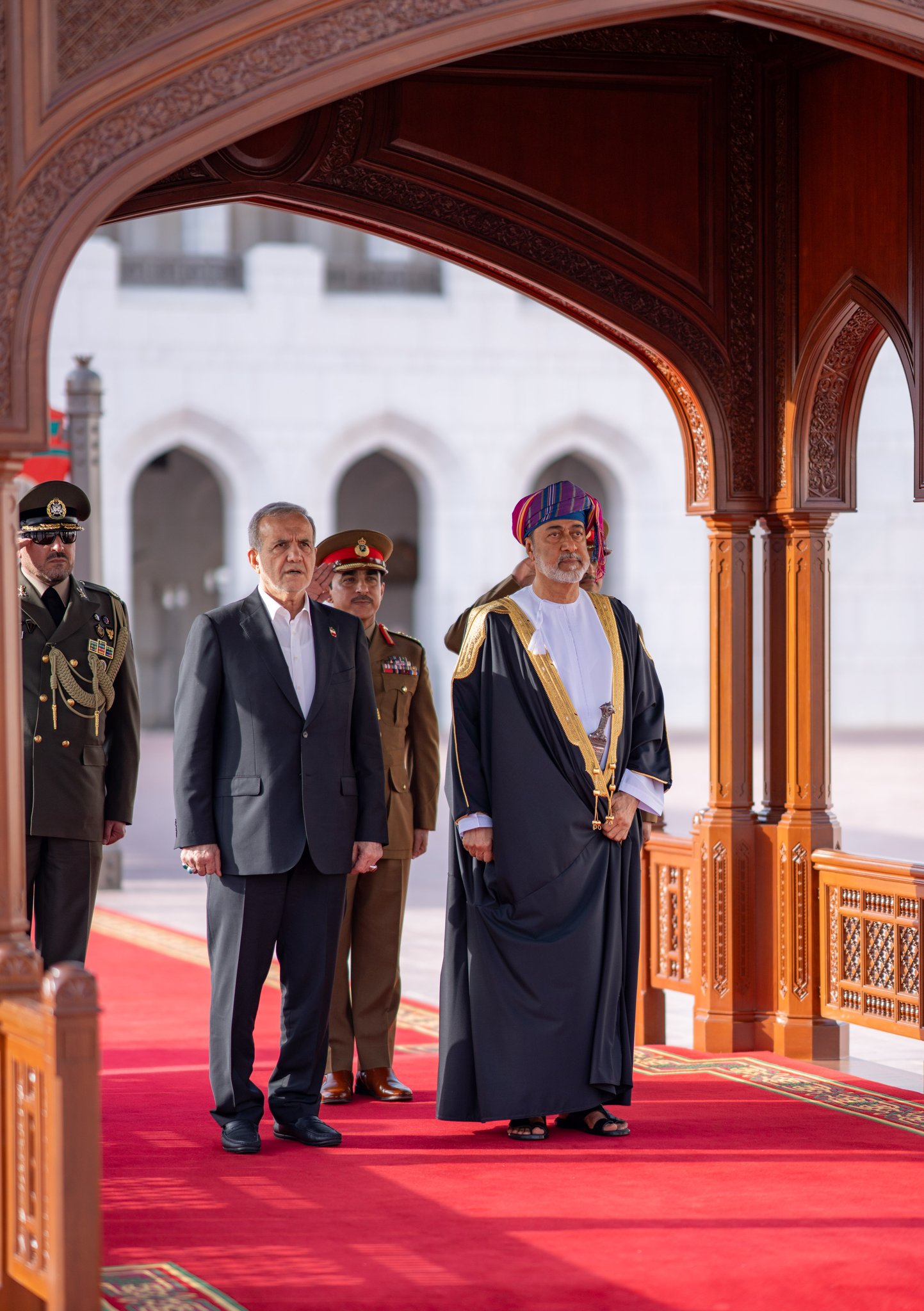وكانت قد أُجريت مراسمُ استقبال رسميّة تكريما للرئيس الدكتور مسعود بزشكيان رئيس الجمهورية الإسلامية الإيرانية مساء مس بقصر العلم العامر بمناسبة زيارته الرسمية إلى سلطنة عُمان.