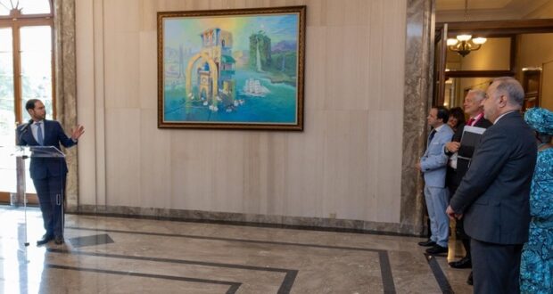 وبيّن السفير قائلا، أن اللوحة ستعلق في قاعة تتوسط مبنى منظمة التجارة العالمية تُدعى “Salle des Pas Perdus”، والتي تعد بمثابة متحف حيّ للتعددية، والفن، والتاريخ المشترك، حيث تردد جدرانها صدى خطوات أجيال من الدبلوماسيين.