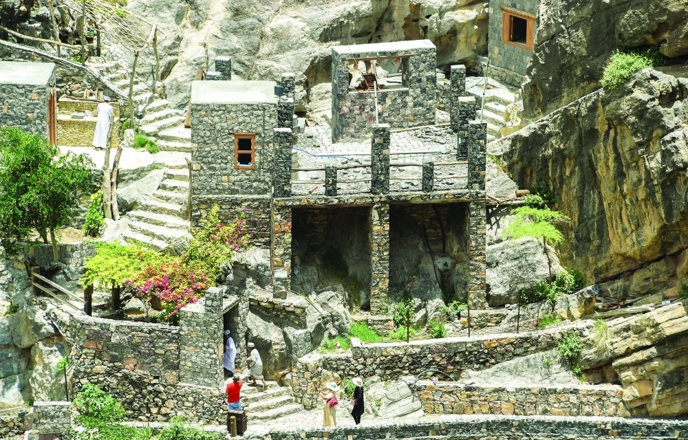 وتحكي القرية قصة تلاحم الإنسان مع بيئته الجبلية الصعبة وكيف استطاع أن يستثمر مواردها الطبيعية بحكمة وإبداع، حيث شق الأهالي حواف الجبال والصخور ومهدوها لجعلها مدرجات زراعية نضرة يزع فيها مختلف أنواع المزروعات، من بينها النخيل، والعنب، والرمان، والليمون، وبعض المحاصيل الموسمية التي تسقى بالعيون والسدود عبر قنوات صغيرة تجري في جداولها لتصب في حوضٍ مائي كبير.