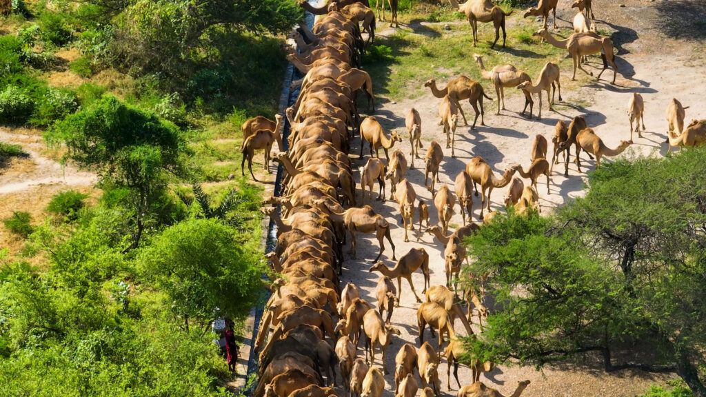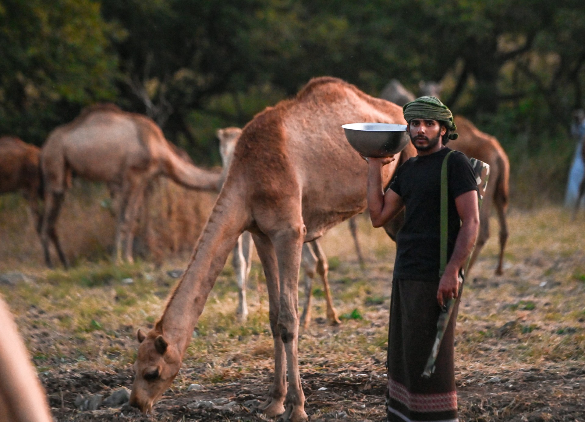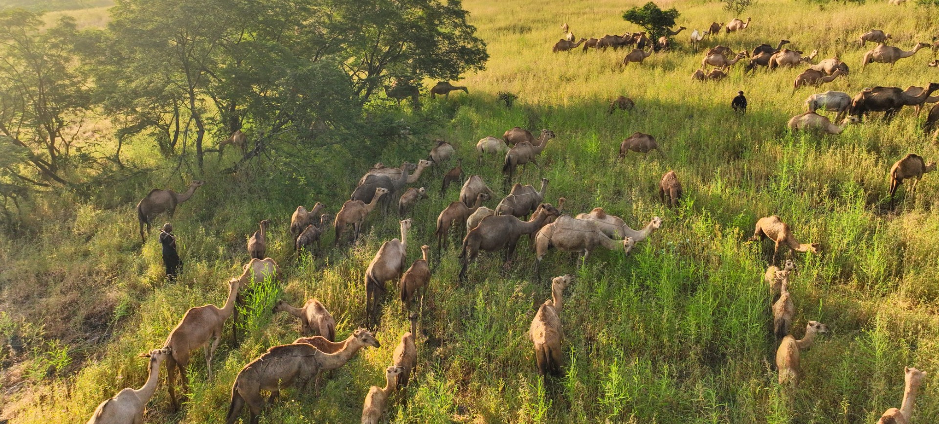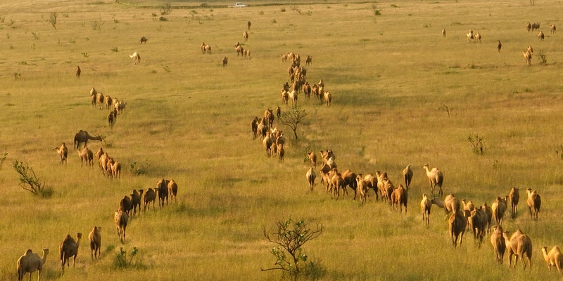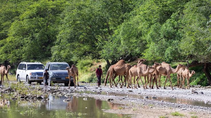 ملاك الإبل ينقلونها في مجموعات من السهول ومناطق خلف الجبال إلى أماكن الرعي