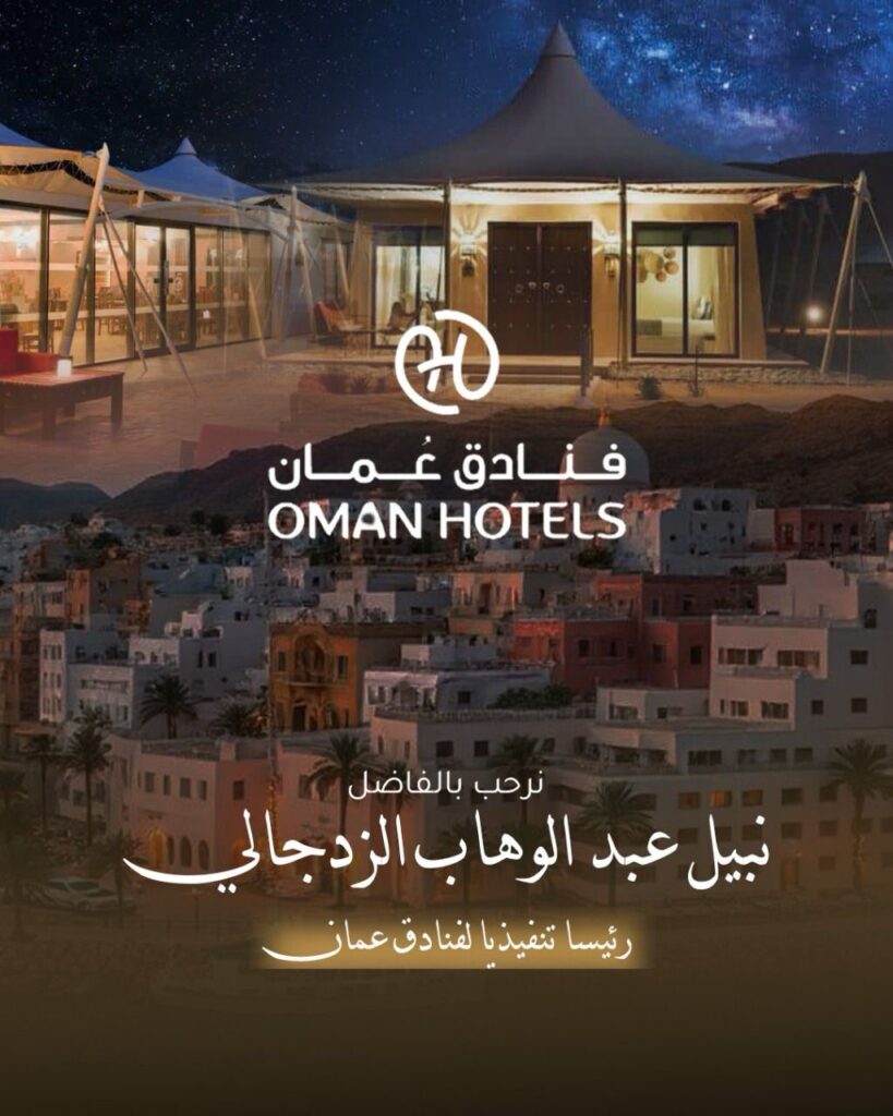 أعلنت شركة عُمان للفنادق والسياحة، “عُمان للفنادق والسياحة”، عن تعيين نبيل بن عبدالوهاب بن علي الزدجالي رئيساً تنفيذياً للشركة، اعتباراً من 12 أكتوبر 2025.
