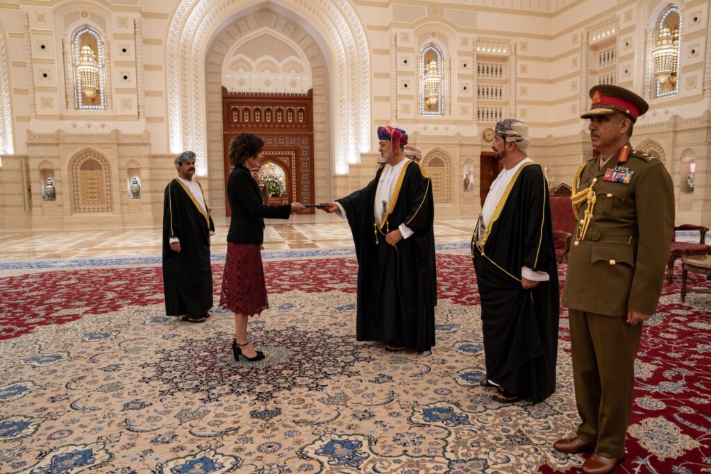 حضر مراسم تقديم أوراق الاعتماد معالي السيد وزير ديوان البلاط السلطاني، ومعالي السيد وزير الخارجية، واللواء الركن قائد الحرس السلطاني العُماني، والمرافقان العسكريان لجلالة السُّلطان.
