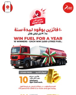ويتضمن العرض اختيار 10 فائزين بوقود مجاني لمدة عام كامل (3650 لتر لكل فائز)، إضافة إلى 10 فائزين بسبائك ذهبية يبلغ وزن كل منها 5 جرام لكل فائز.