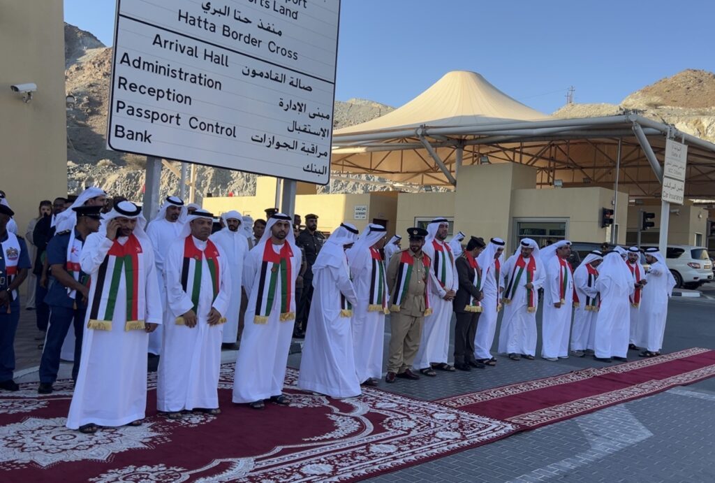 كما تم توزيع الهدايا التذكارية على القادمين إلى إمارة دبي عبر المنفذ حتا البري.