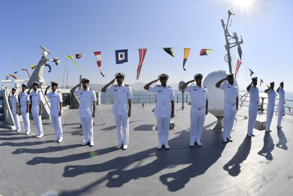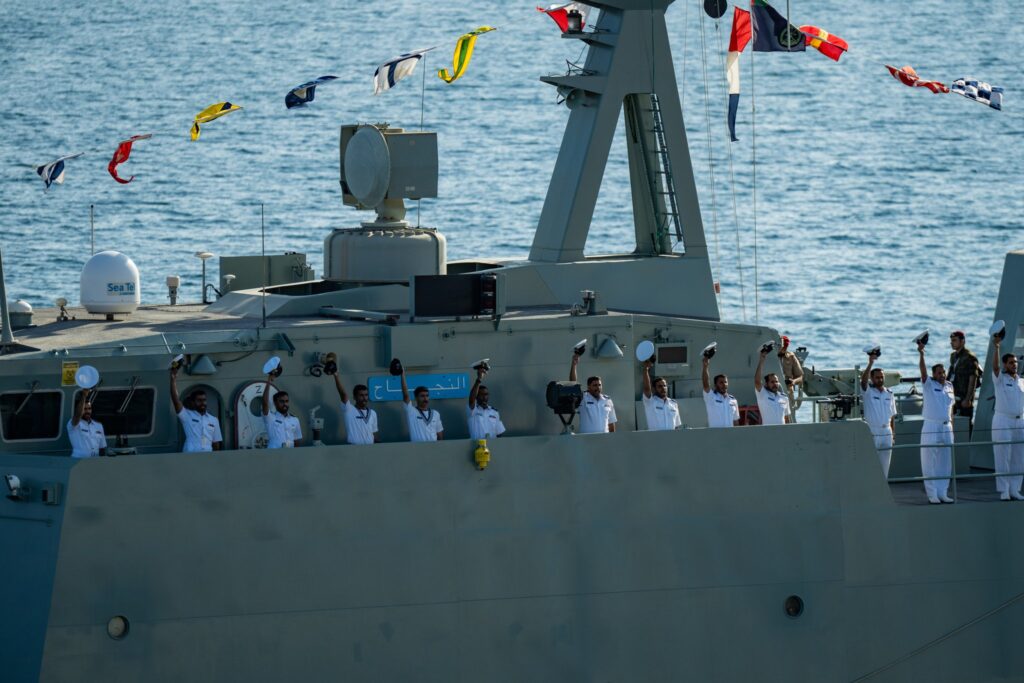 وعند اقترابِ اليخت السُّلطانيّ من موقع سفن الاستعراض والمحاذِي لشاطئ القرم، أطلقت سفينةُ البحريّة السُّلطانيّة العُمانيّة (شباب عُمان الثّانية) إحدى وعشرين طلقةً تحيّةً لجلالةِ القائد الأعلى، كما أدّت السُّفنُ المُشاركة لدى مرور اليخت السُّلطانيّ (فلك السّلامة) بمُحاذاتها التحيّةَ العسكريّةَ البحريّةَ للمقام السّامي، رعاهُ اللهُ، والهتافَ ثلاثًا بحياةِ جلالةِ السُّلطان هيثم بن طارق المعظم القائدِ الأعلى، أبقاهُ اللهُ.
