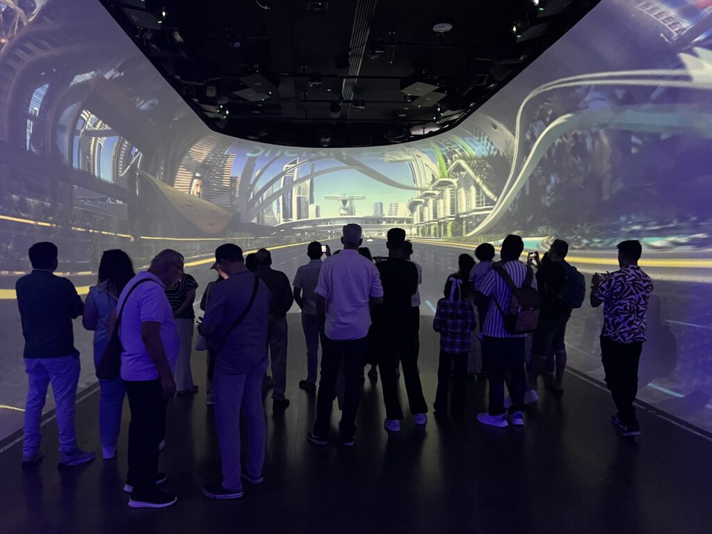 أما عند النزول فإنك تكتشف خلال زيارتك لمنطقة المستقبل هذه كيف ستبدو دبي بعد 50 عاماً، مع سيارات تاكسي طائرة، وبيوت تحت الماء ومهمات إلى الفضاء.