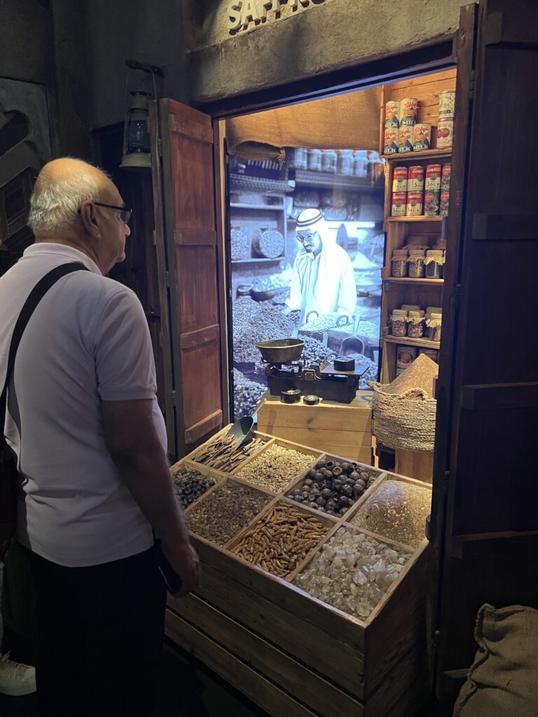 كان المكان يعج بالزوار ولكن كان هناك تنظيما كبيرا للدخول على مجموعات، فعند دخولك تجد مثل أسواق ومحلات دبي القديمة التي تبيع الأقمشة وبعض الأعشاب وهو يعيدك إلى شيء من الماضي الجميل.