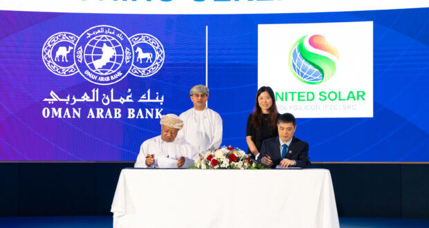 وقع بنك عُمان العربي وشركة يونايتد سولار بولي سيليكون ، اتفاقية تمويل محورية لدعم إنشاء منشأة متطورة لإنتاج البولي سيليكون في المنطقة الحرة بصحار، وذلك على هامش قمة الرؤساء التنفيذيين لبنك عُمان العربي 2025، التي أُقيمت بتاريخ 17 نوفمبر 2025 تحت رعاية معالي سالم بن ناصر العوفي وزير الطاقة والمعادن.