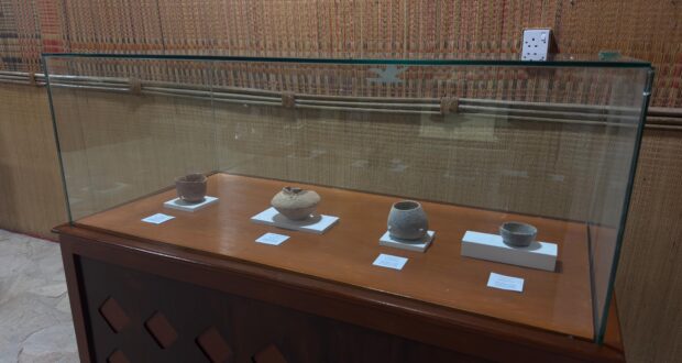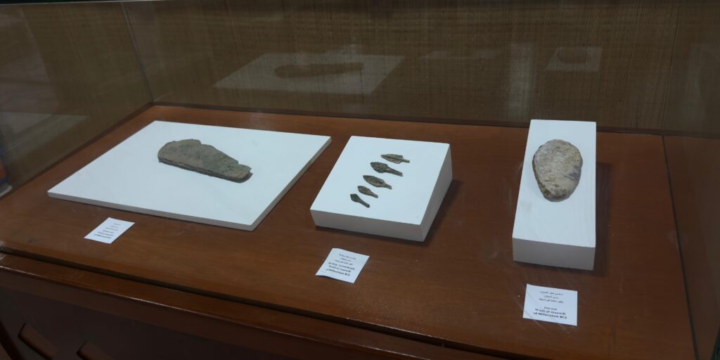 وتضمن المعرض عدد من المقتنيات الأثرية التي تعود إلى فترتي الألف الثالث والثاني قبل الميلاد، حيث شملت الأواني الحجرية ورؤوس سهام برونزي وجرة على نمط جمدة النصر وكوب فخاري، بالإضافة إلى أداة من حجر الصوان تعكس جانباً من الحياة الحضرية والأنشطة الإنسانية في تلك الحقبة الزمنية المبكرة.