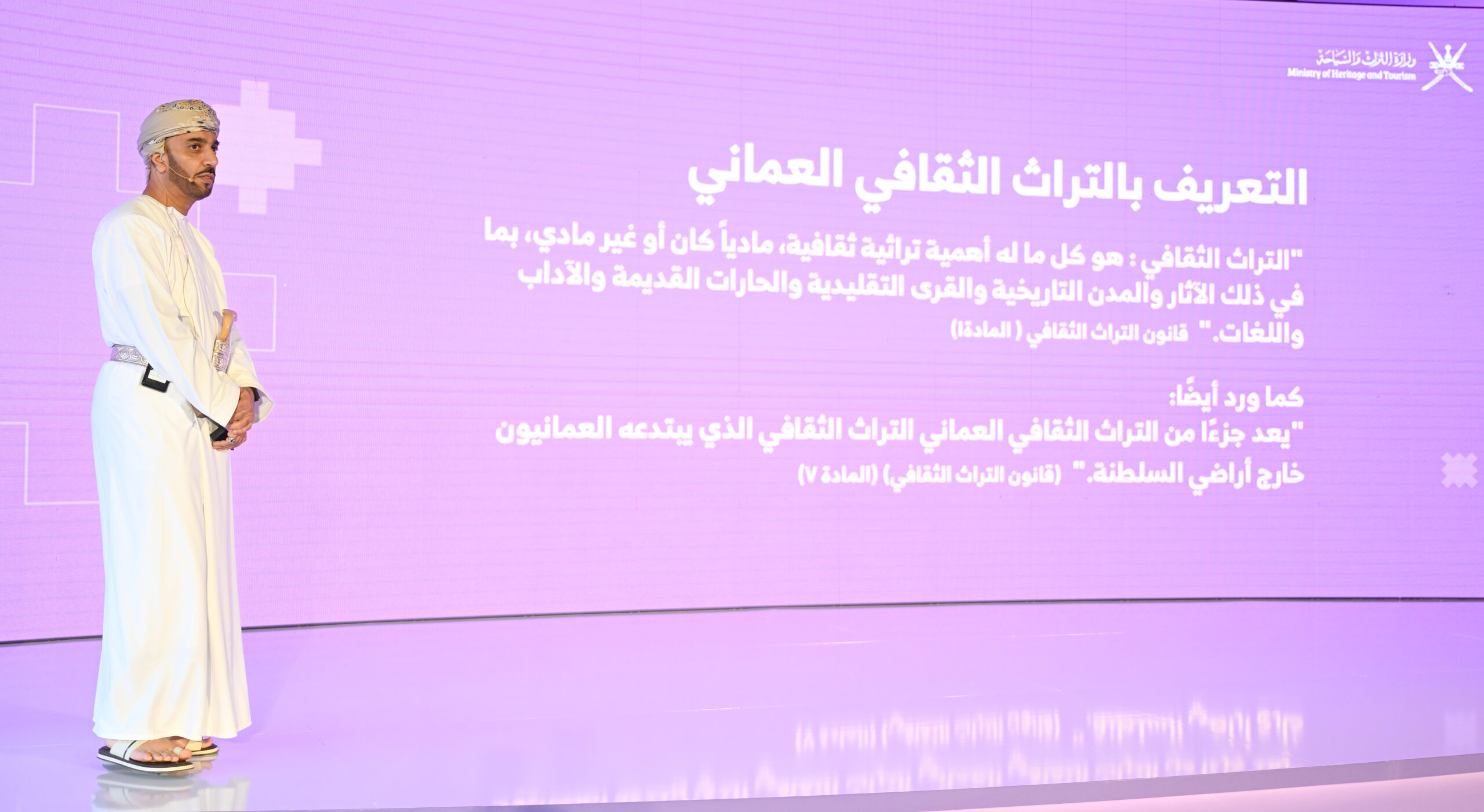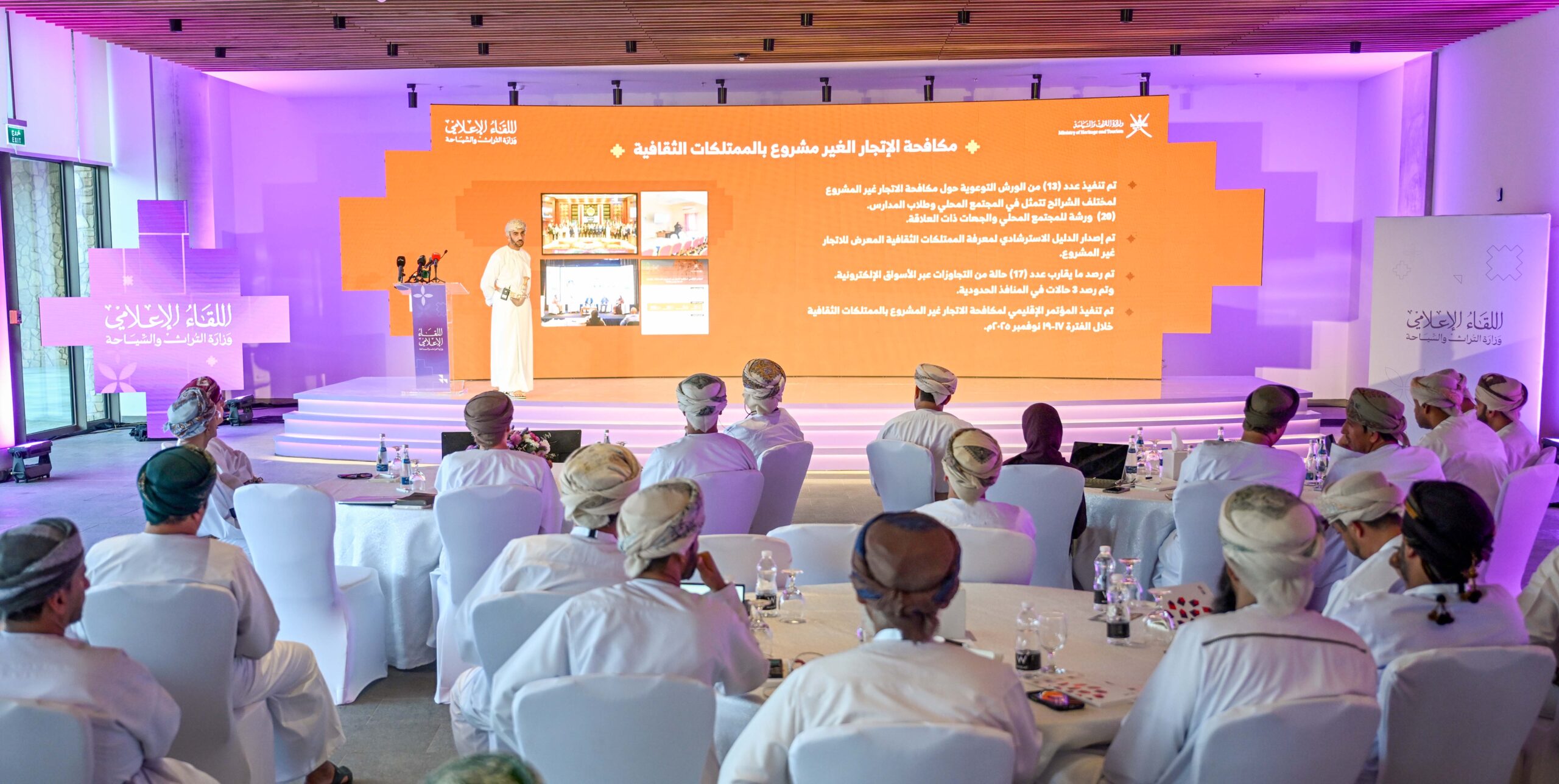وفي جانب التراث، قال سعادة المهندس إبراهيم بن سعيد بن خلف الخروصي، وكيل وزارة التراث والسياحة للتراث، إن الوزارة حققت خلال الفترة من عام 2021م إلى عام 2025م سلسلة من الإنجازات النوعية في مجالات حفظ وصون وتوثيق التراث الثقافي العُماني. وأوضح أن من أبرز هذه الإنجازات إعداد سجل التراث الثقافي العُماني، الذي يضم تطبيقاً للهواتف الذكية، وموقعًا إلكترونيًا، وقاعدة بيانات متكاملة تشمل الممتلكات الثقافية لدى الوزارة والمتاحف الحكومية والخاصة، بما يسهم في توثيق التراث وإتاحته للباحثين والمهتمين.