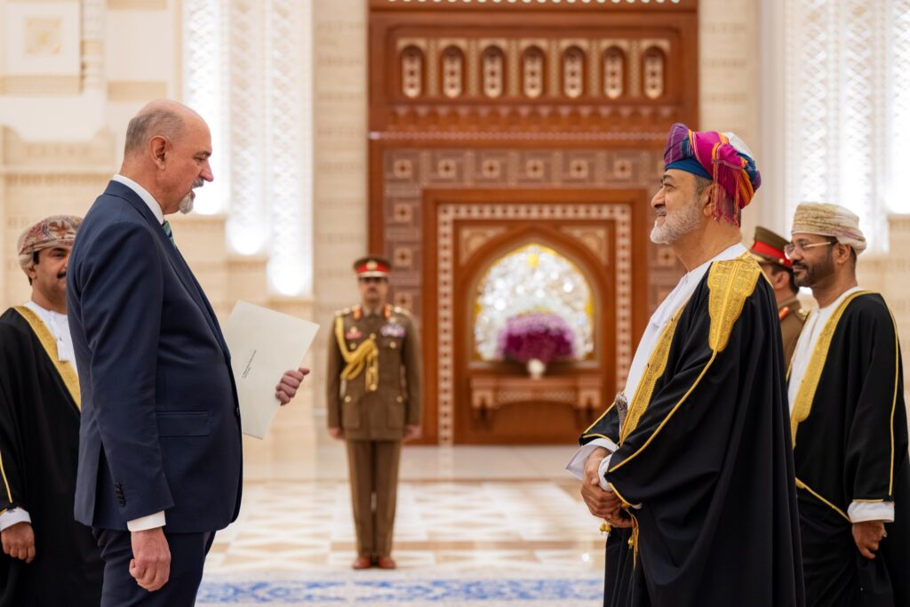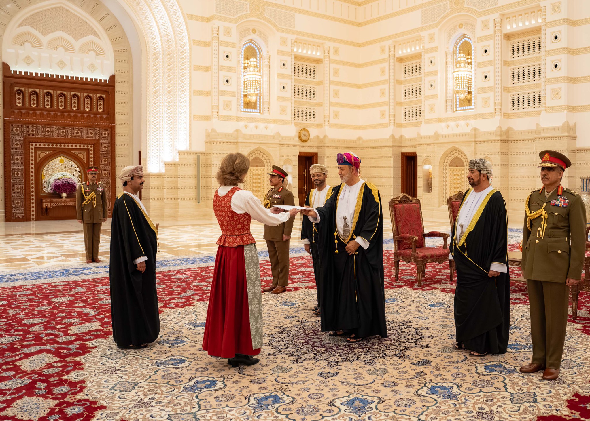 فقد تقبّل جلالتُه أوراق اعتماد كـلٍّ من سعادةِ السّفير تشارلز كينجستون سفيراً فوق العادة مُفوّضاً من قبل سيندي كيرو الحاكمة العامة لنيوزيلندا معتمداً لدى سلطنة عُمان، وسعادةِ السّفير يفجيني سوبوليفسكي سفيراً فوق العادة مُفوّضاً من قبل الرّئيس ألكسندر لوكاشينكو رئيسِ جمهوريّة بيلاروس معتمداً لدى سلطنةِ عُمان، وسعادةِ السّفير هونج هو آنه سفيراً فوق العادة مُفوّضاً من قبل الرئيس لونج كوونج رئيس جمهوريّة فيتنام الاشتراكيّة معتمداً لدى سلطنةِ عُمان، وسعـادةِ السّفير ميجيل بورتو براجا سفيراً فوق العادة مُفوّضاً من قبل الرئيس ميغيل دياز كانيل رئيس جمهوريّة كوبا معتمداً لدى سلطنة عُمان، وسعادةِ السّفيرة كريستي تورمسدال سفيرةً فوق العادة مُفوّضةً من قبل جلالةِ الملك هارالد الخامس ملك مملكة النرويج معتمدةً لدى سلطنةِ عُمان، وسعادةِ السّفير مايلز أرميتاج سفيراً فوق العادة مُفوّضاً من قبل سام موستين الحاكمة العامة لكومنولث استراليا معتمداً لدى سلطنةِ عُمان، وسعادةِ السّفير أندي رودريجيز دوران سفيراً فوق العادة مُفوّضاً من قبل الرئيس لويس أبي نادر رئيس جمهوريّة الدّومنيكان معتمداً لدى سلطنةِ عُمان، وسعادةِ السّفير شيبا شومبياوندا سفيراً فوق العادة مُفوّضا من قبل الرئيسِ إيمرسون منانجاجوا رئيسِ جمهوريّةِ زمبابوي معتمداً لدى سلطنةِ عُمان، وسعادةِ السّفير بافل كافكا سفيراً فوق العادة مُفوّضاً من قبل الرّئيسِ بيتر بافيل رئيسِ الجمهوريّة التشيكيّة معتمداً لدى سلطنةِ عُمان، وسعادةِ السّفيرة زريدة بنت عبدالله سفيرةً فوق العادة مُفوّضةً من قبل الرئيس ثارمان شانموجاراتنام رئيسِ جمهوريّةِ سنغافورة معتمدةً لدى سلطنةِ عُمان، وسعادةِ السّفيرة كاتارينا فارفايجو سفيرةً فوق العادة مُفوّضةً من قبل الرّئيس كونستانتينوس تاسولاس رئيس الجمهوريّة اليونانيّة معتمدةً لدى سلطنةِ عُمان.