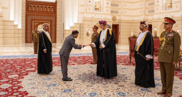 تقبّل حضرة صاحب الجلالة السُّلطان هيثم بن طارق المعظّم، حفظهُ اللهُ ورعاهُ، بقصر البركة العامر صباح الاربعاء، أوراق اعتماد عددٍ من أصحاب السعادة سفراء الدول الشقيقة والصديقة لدى سلطنة عُمان، وهم كل من: سعادة السفير/ أحمد محمود الروضي، سفيراً فوق العادة مفوضاً من قِبل الرئيس/ محمود عباس رئيس دولة فلسطين، رئيس اللجنة التنفيذية لمنظمة التحرير الفلسطينية، معتمداً لدى سلطنة عُمان. وسعادة السفير/ مجدي رمضان، سفيراً فوق العادة مفوضًا من قِبل الرئيس العماد/ جوزاف عون رئيس الجمهورية اللبنانية، معتمداً لدى سلطنة عُمان. وسعادة السفير/ ويجيسينجهي دي الويس، سفيراً فوق العادة مفوضاً من قِبل الرئيس/ أنورا كومارا ديساناياكي رئيس جمهورية سريلانكا الديمقراطية الاشتراكية، معتمداً لدى سلطنة عُمان. وسعادة السفيرة/ نور العين جبيرة باجا، سفيرة فوق العادة مفوضة من قِبل الرئيس/ فيرديناند ماركوس الابن رئيس جمهورية الفلبين، معتمدة لدى سلطنة عُمان. وسعادة السفير/ آدم باغودو زكاري، سفيراً فوق العادة مفوضاً من قِبل الرئيس/ باتريس تالون رئيس جمهورية بـنـيـــن، معتمداً لدى سلطنة عُمان. وسعادة السفير/ ريكاردو سيلفا سانتيستيبان بنزا، سفيراً فوق العادة مفوضاً من قِبل الرئيس/ خوسيه خيري رئيس جمهورية بيرو، معتمداً لدى سلطنة عُمان. وسعادة السفير/ سايمر بالا، سفيراً فوق العادة مفوضًا من قِبل فخامة الرئيس/ بيرم بيغاي رئيس جمهورية ألبانيا، معتمداً لدى سلطنة عُمان. وسعادة السفير/ خوسيه أجوير أفيلا، سفيراً فوق العادة مفوضاً من قِبل الرئيس/ سانتياجو بينيا رئيس جمهورية الباراجواي، معتمداً لدى سلطنة عُمان. وسعادة السفير/ محمد إس باري، سفيراً فوق العادة مفوضاً من قِبل الرئيس/ جوليوس مادا بيو رئيس جمهورية سيراليون، معتمداً لدى سلطنة عُمان. وسعادة السفير البروفيسور/ مختار خضر عبده، سفيراً فوق العادة مفوضاً من قِبل الرئيس/ تاي اتسقي سيلاسي رئيس جمهورية أثيوبيا الفيدرالية الديمقراطية، معتمداً لدى سلطنة عُمان. وسعادة السفير/ رومند سارسيرو، سفيراً فوق العادة مفوضاً من قِبل الرئيسة/ ميريام سبيتري ديبونو رئيسة جمهورية مالطا، معتمداً لدى سلطنة عُمان. وسعادة السفير/ إيزاك بيرما سبيولمي، سفيراً فوق العادة مفوضاً من قِبل الرئيس/ يوري موسيفيني رئيس جمهورية أوغندا، معتمداً لدى سلطنة عُمان.